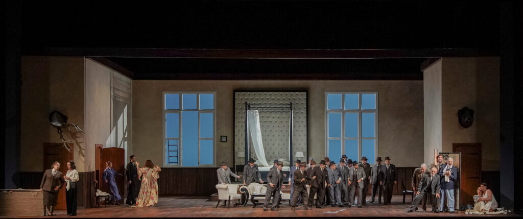 Την επιτυχημένη σκηνοθεσία, η οποία πρωτοπαρουσιάστηκε στην Εθνική Λυρική Σκηνή τη σεζόν 2022/23, υπογράφει ο διεθνώς καταξιωμένος Βρετανός σκηνοθέτης Στήβεν Λάνγκριτζ. Την αναβίωση της σκηνοθεσίας έχει αναλάβει η Κατερίνα Πετσατώδη. Ο Λάνγκριτζ ματαφέρει την ιστορία του Φάλσταφ στην Αγγλία της δεκαετίας του ’30, μια εποχή όπου κυριαρχούσε ο παραλογισμός της κοινωνικής ιεραρχίας, στα όρια της φεουδαρχίας. Ο σκηνοθέτης σημειώνει: «Η παράστασή μας εκτυλίσσεται στην Αγγλία τη δεκαετία του 1930. Σε μια εποχή μεταξύ πολέμων (ο Φάλσταφ ήταν ένας παλιός στρατιώτης), μ’ έναν σκανδαλώδη Πρίγκιπα της Ουαλίας (όπως ο Χαλ στον Ερρίκο Δ΄), ο οποίος θα γίνει για λίγο ο βασιλιάς Εδουάρδος Η΄, και μια εποχή κατά την οποία οι ιεραρχίες είναι αυστηρές και η κοινωνική τάξη σημαντικότερη από την οικονομική επιφάνεια. Ο Φάλσταφ είναι βασισμένος στη μοναδική καθαρά αγγλική κωμωδία του Σαίξπηρ, αλλά το τέλος του φέρει ξεκάθαρα τη σφραγίδα των Βέρντι και Μπόιτο. “Tutto nel mondo è burla” (Όλα στον κόσμο είναι μια φάρσα) –αυτό είναι το συμπέρασμά τους– κι αν κοιτάξουμε τον σημερινό χαοτικό κόσμο που μας περιτριγυρίζει, δεν μπορούμε παρά να συμφωνήσουμε, και τότε ίσως να βγούμε έξω για μια χλιαρή μπίρα και να γελάσουμε παρέα με τον Σερ Τζων».